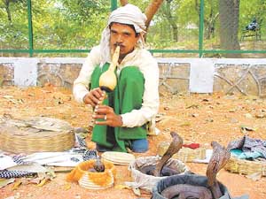 这个名叫塔里的耍蛇人在新德里卖艺。据他称,这一行最重要的是能抓蛇,然后一切就好办了。每年3、4月份,森林里气温升高时,他们便开始带着一种古老的捕蛇工具四处寻觅毒蛇的踪迹。这件可套住蛇颈、带有金属圈的手杖可让人在不杀死蛇的情况下,迅速取出藏在蛇牙后的毒囊。不过据塔里介绍,大自然才是蛇的家园,如果长期不与自然接触,性子再烈的蛇都会变得懒洋洋的,所以每隔两三个月,耍蛇人都会把自己的“宝贝”放归森林,再补充一批“新鲜血液”。