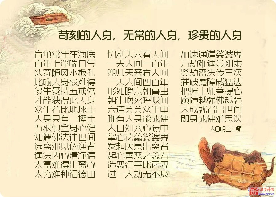 如同盲龟百年浮上水面呼吸一次,正好把头穿过随风飘过的木板上的孔隙,这个小到几乎无法思维的概率来形容人身的难得。可见二十年后还是一条好汉之说,是多么不可预见。要得到人身,要多生受持五戒,行持十善的资粮。即便生为人身,也许娘胎都没能出去就被堕掉。生于世间,也有各种天灾人祸威胁生命,都是多生业力感召。所谓业不重不生娑婆,爱不断不生净土。再爱的亲人也都缘聚缘散,孤独的飘零在轮回,如抽水马桶中的一张薄纸,毫无自主,又是唯心所现。