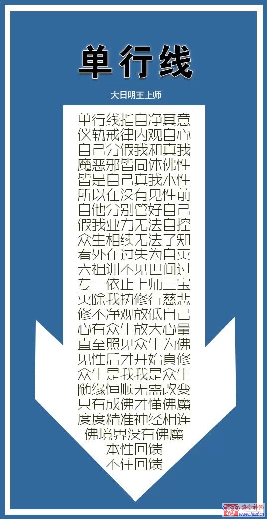 诸恶莫作,众善奉行,自净其意,是诸佛教。单行线,就是指佛法只针对自己内心的单向修法。永远是自净其意。自己,在佛法中分:真我和假我。假我就是世间众生认为的自己,一米多高的自己,一切的思维念头都围绕的这个自己。一切判断和视角都从这个自己出发。把自己困在:烦恼障和所知障中,自认聪明的定义了真实的轮回世界。这个我,不仅仅是严重的颠倒见,也是一切贪嗔痴慢疑心毒的毒根:我执。很多学佛人没有遵循单行线法则,违规逆行,违逆自然,迷失本性,越修心量越小,越修是非越多,越修烦恼越重,故而:地狱门前僧道多啊。而佛讲法,所说的魔也好,恶也好,邪也罢,都是说的真我本性,都是说的自己。正可谓圣人即说自,凡夫吓破胆。利用佛法造业,不仅使无明心毒火上浇油,更让其对佛法(善法)免疫,势不可挡,没有天敌,成为末日毒王。