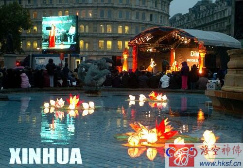 11月7日,在英国伦敦市中心著名的特拉法加广场,一朵朵莲花灯漂浮在水池中。排灯节是印度教的重要节日,每年10月底或11月初到来。为了迎接排灯节,印度的家家户户都会点起油灯,因为它们象征着光明、繁荣和幸福。由于印度教在英国是较大的宗教团体,所以伦敦也感染了几分排灯节的气氛。