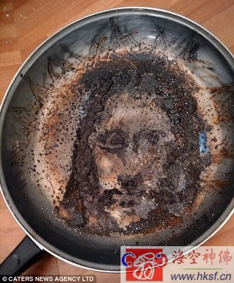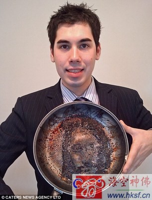 国际在线专稿:据英国《每日邮报》报道,英国一名22岁的银行工作人员托比(Toby Elles)跟室友夜里在家中喝啤酒吃宵夜,但负责烹饪的他却在沙发上睡着了,当然熏肉也烧焦了,但锅子没有被烧破。当托比把烧焦的熏肉刮除后发现,锅中剩余的油渍痕迹就像是一张人脸,搭配头发、胡子,看起来就跟耶稣没两样。